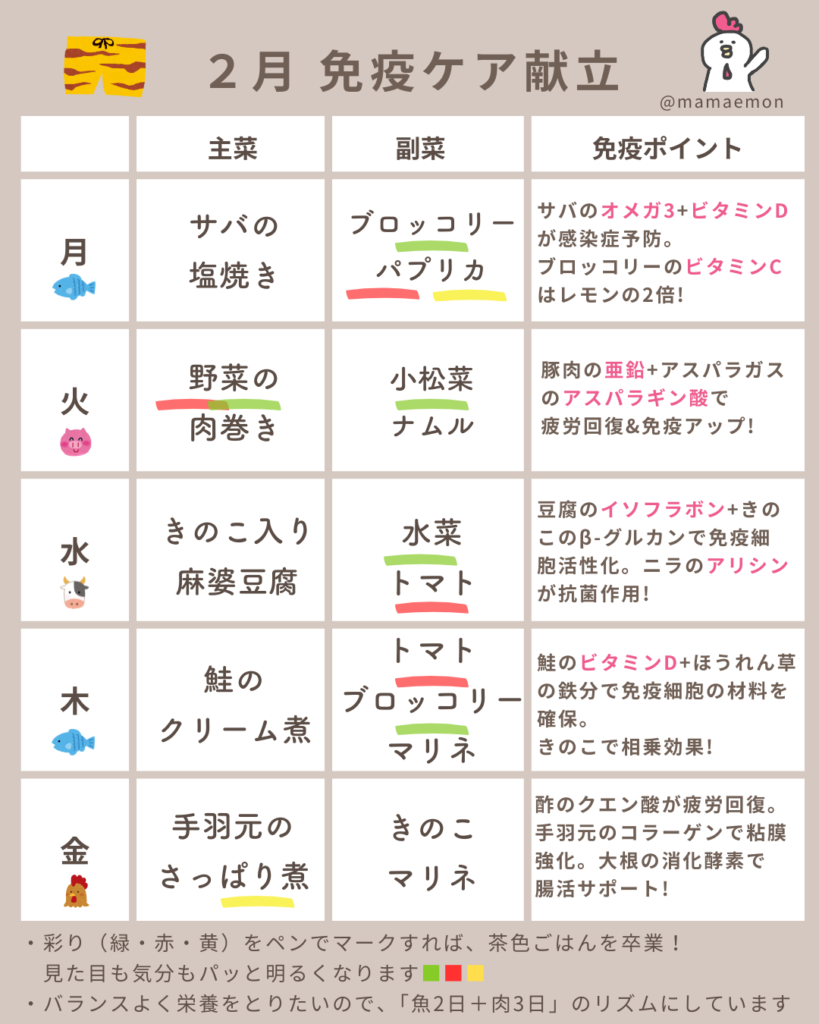 | 曜日 | メイン料理 | 下味冷凍 | 免疫サポート成分 |