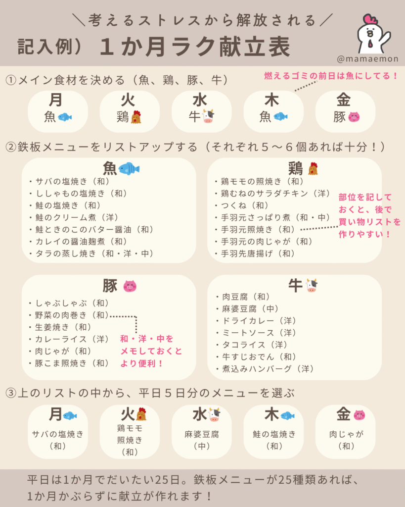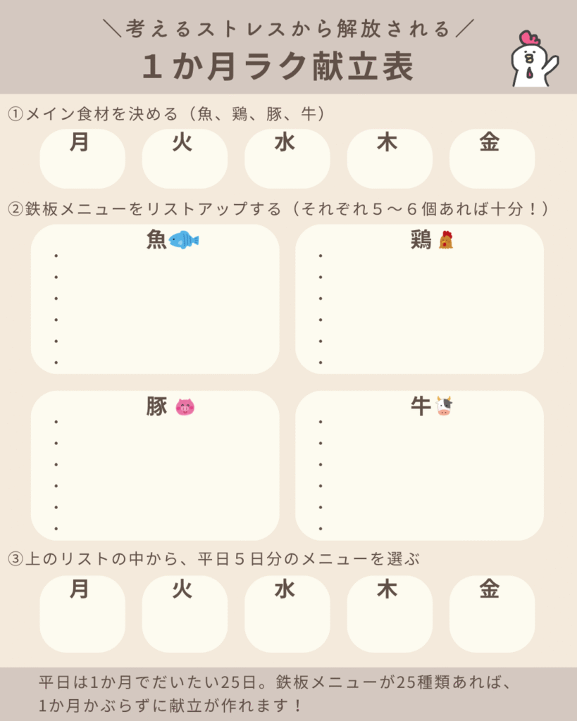 そこで私は、魚・鶏・豚・牛の4種類にメイン食材を固定し、各ジャンルの“鉄板メニュー”をあらかじめ決めておく仕組み化を導入。結果、平日5日×5週間=1か月を25メニューで迷わず回せるようになりました。