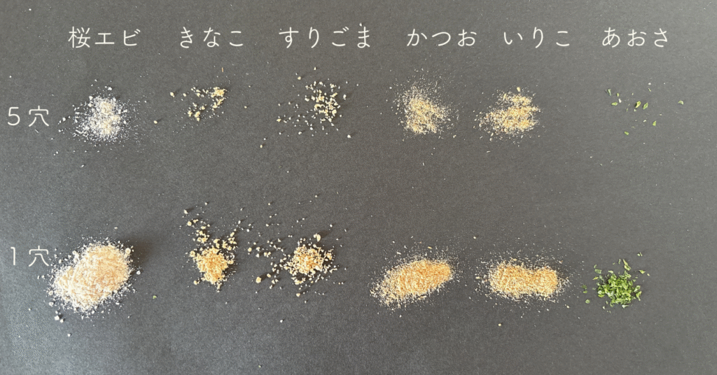 - かつお節粉末 → サラサラなので1穴・5穴どちらでもOK。